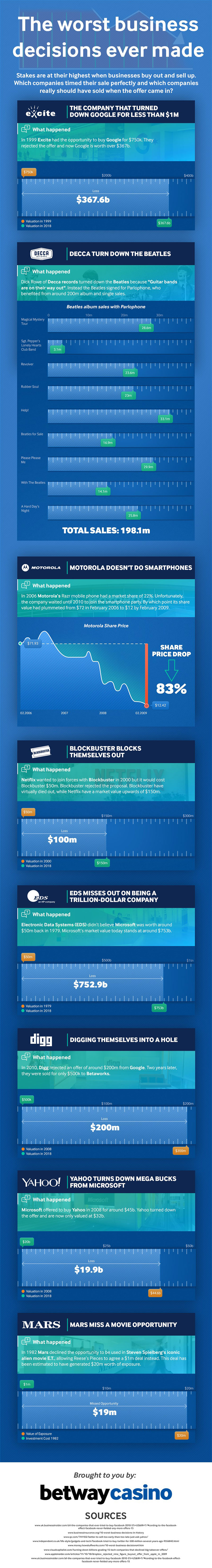 Trail and error is the key to success but sometimes what seems like a good idea at the time might just have you losing opportunities, ruining relationships and worst of all, costing you a lot of money. Bad decisions happen to everyone. Betway have put together an infographic exploring the worst business decisions of all time in order to make you feel all that bit better, as surely your bad decisions can’t be as bad as these, can they?